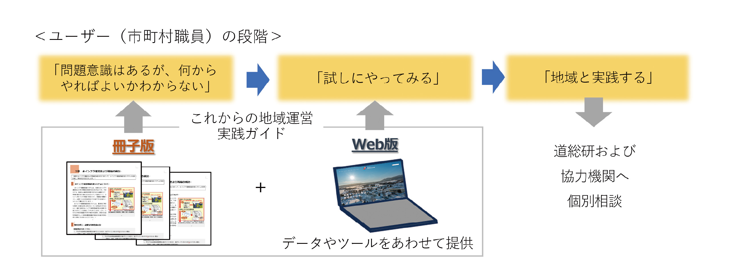 さらに、道総研では、ミニマガジン「地域運営LABO」も発行しています。 これは、皆様が取り組もうとしている「これからの地域運営」のイメージを、一般の方々にもわかりやすく伝えるためのツールであり、「これからの地域運営」に挑戦しようとする皆様(主には市町村職員)の「相棒」となることを目指して発行しました。 ぜひ、あわせてご活用ください。