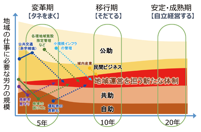 北海道は居住域が広域であり、かつ人口が低密度に分散しています。 道路、水道等インフラの整備や除雪サービス、医療・福祉サービス等を担っている行政による「公助」は、税収入減や職員減少で負担が増加しつつあります。 また、主に民間ビジネスが担ってきた小売業や流通、交通については、収入減少や従業員不足により集落部で事業継続が困難となっています。 さらに、地域の共助組織である町内会は、人口減少と高齢化に加え、リーダーの担い手不足の問題を抱えています。 結果、買い物や通院の移動に「自助」の比重が増加し、地域での居住をあきらめざるをえない住民もいます。 地域運営に必要な労力の将来変化のイメージを図1に示します。 このままでは、公助、民間ビジネス、共助、自助の力がやせ細り、地域運営に「すき間」が生じてくる可能性があります。