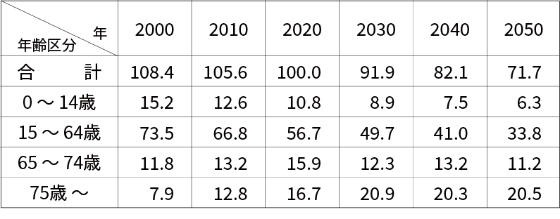市町村や地域の将来人口を共有しましょう。 将来人口予測は、国立社会保障・人口問題研究所※1 や国土交通省※2 などが示していますので、市町村または当該地域ごとに集計することで、将来人口予測を示すことができます(参考:表1) 。 特に次のポイントを共有しましょう。