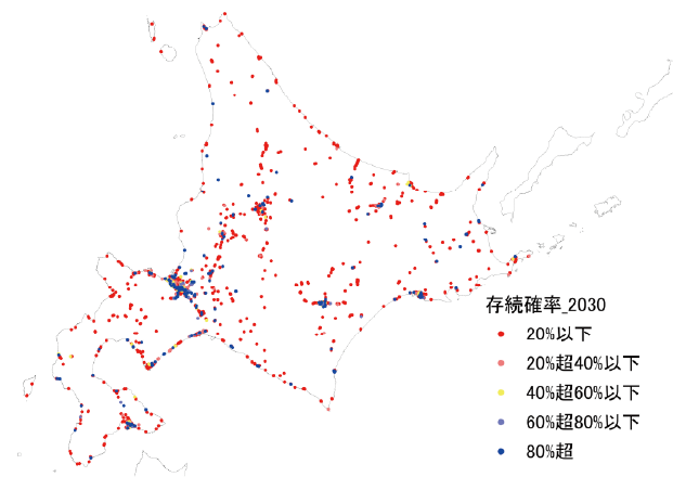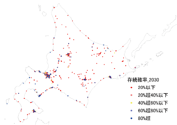 身近な生活機能が、将来どのようになるかを確認しましょう。 道総研建築研究本部では、将来の人口の変化などから、現在あるスーパーマーケットやガソリンスタンドの存続確率を算出できるモデルを提供可能です(図2、3) (一般公開はしていませんので道総研に直接お問い合わせください)。 生活機能の存廃予測結果を住民と共有することは、課題を「自分ごと」としてもらうきっかけとなります。