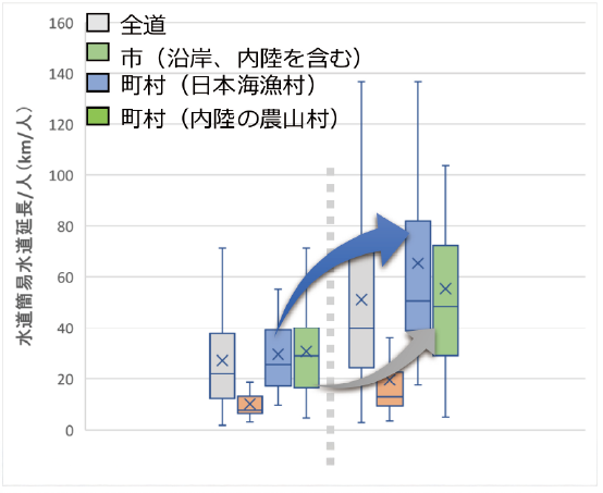生活に必要な道路、水道などのインフラは、人口が減少しても、同じように延長が短くなるわけではありません。 基本的には、 現在の道路、水道などのインフラを、将来の人口で維持していく必要があります。 試しに、現在の維持管理費や管理延長を、現在人口と将来人口で割って1人あたりの負担量の変化を比較してみましょう。 図4は北海道内の水道の例ですが、全体的に、2倍近い負担となります。 また、市町村面積が大きいわりに人口が小さな町では、特に負担が大きくなることがわかります。
