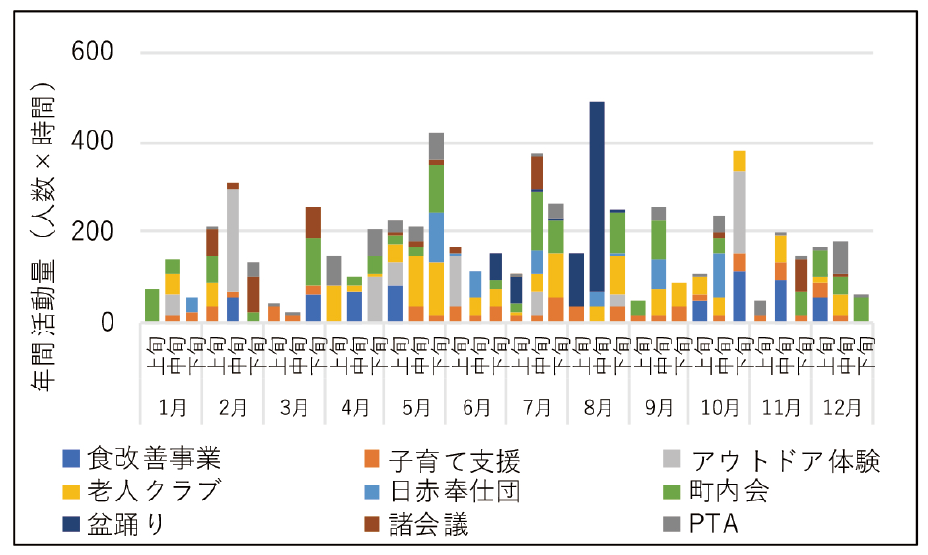 ここでは、 町内会等の既存組織が行ってきた地域運営活動を見直すため、 地域の維持管理活動や行事、会議などを「棚卸し」し、今後の継続・再編方法を検討する「地域の仕事の棚卸し手法(住民団体編)」を提案します。 今回、道総研の開発したこの手法によって、地域活動のためにどの時期にどの程度の時間を要しているかを見える化できます(図9)。 この結果を地域で共有し、地域の仕事が特定の時期・人に偏っていることの気づきにより、見直しを促していくことができます。 なお、 本手法は地域全体を俯瞰して見ることが目的です。 調査を厳密にしようとしすぎて、作業がかえって負担にならないよう留意しましょう。