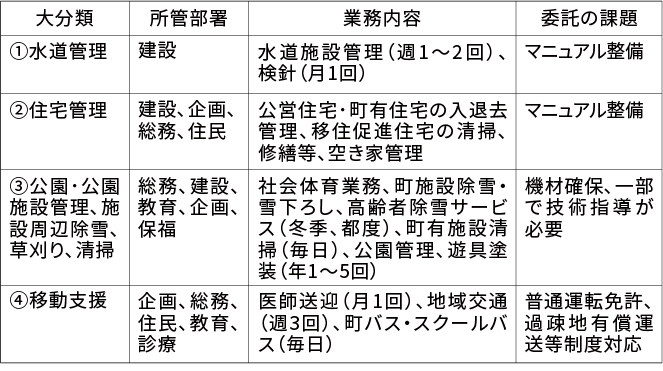 ここでは、行政がこれまで地域のために行っていた仕事を「棚卸し」し、質の向上や地域運営組織の財政的基盤形成の観点から見直すための方法として、 「地域の仕事の棚卸し手法(行政編)」 を提案します。 今回、 道総研の開発したこの手法によって、住宅管理や公園管理、移動支援などの行政の仕事の所管部署や手間が見える化できます(表2)。 この結果に基づき、行政の仕事自体を見直すとともに、地域運営組織への業務委託を通じて地域運営組織の主たる仕事を生み出せる可能性があります。