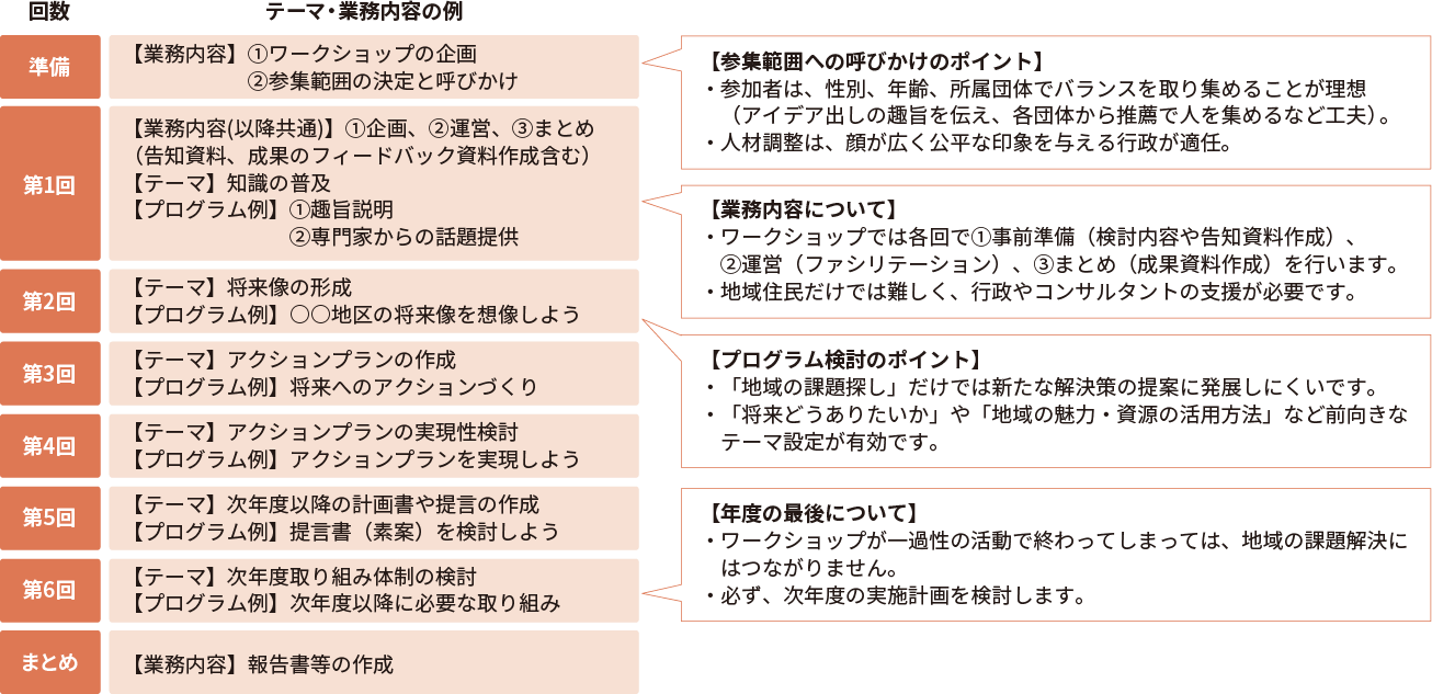 地域の現状を把握したら、それらを地域住民と共有し、地域の将来ビジョンや、課題の解決策を話し合います。ここでは、 地域住民及び関係者が自由に意見を出し合えるワークショップの手法が有効です。 ワークショップの企画の例を図10に示します。 ワークショップは短時間で意見を集めやすく、多くの地域で実施されていますが、ワークショップに慣れた住民の存在や、声の大きな住民の影響を受けやすいデメリットもあります。 多くの個人意見を集めるならアンケートのほうが向いていますし、アイデアの資金調達を考えるなら各種団体の役員の集まりで検討するほうが短時間で済みます。 目的によって適切な方法を選択しましょう。