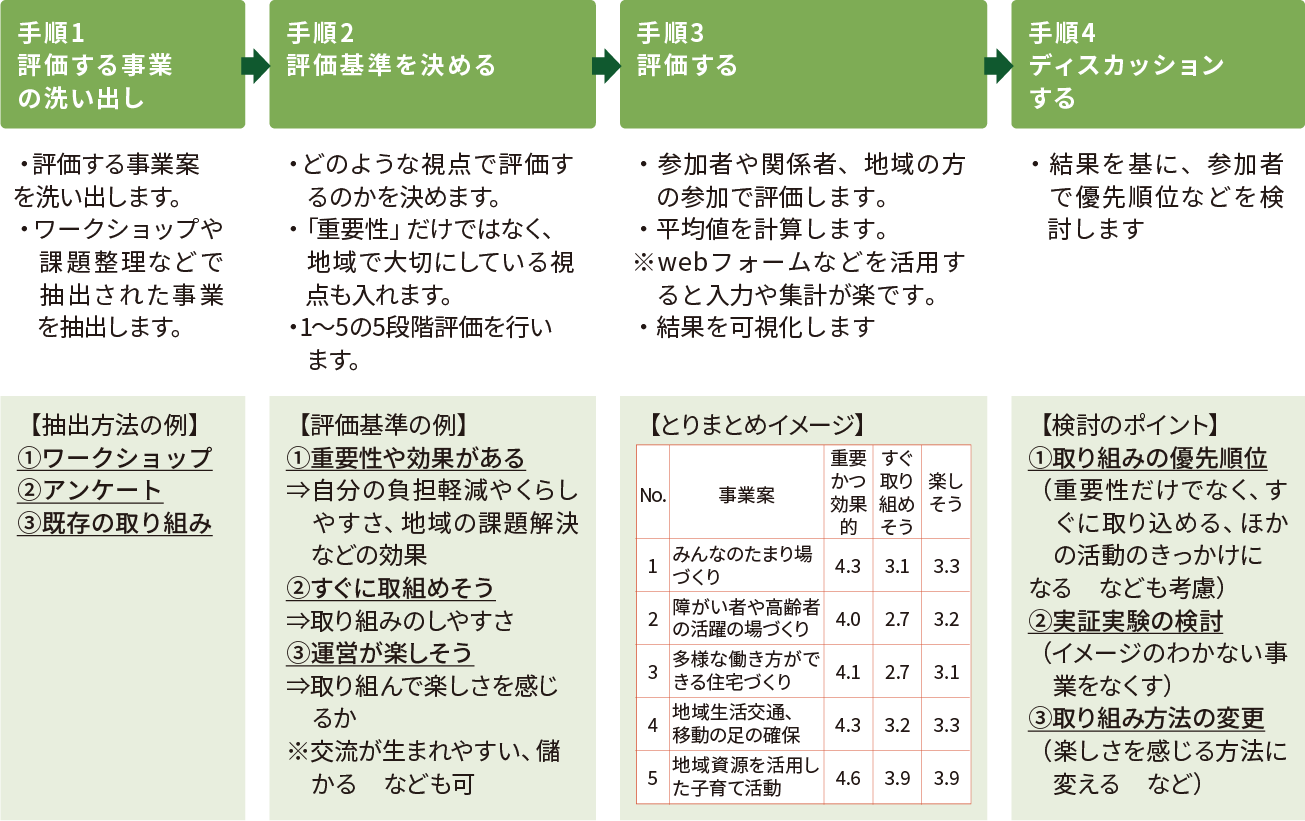 地域で取り組むべき事業アイデアは様々ありますが、全てがすぐに開始できるわけではないため、優先順位を検討して進める必要があります。 地域住民一人ひとり、優先順位の考え方は異なるため、話し合いが平行線になる場合もあります。 そのような場合は客観的に事業を評価する「TN法」の第1ステップが有効です。 TN法とは東北農業研究センターが開発した、複数の視点から参加者による評価を行い、意見の整理・検討を支援する手法です。 TN法を活用した取組み検討の手順を、図11に示します。