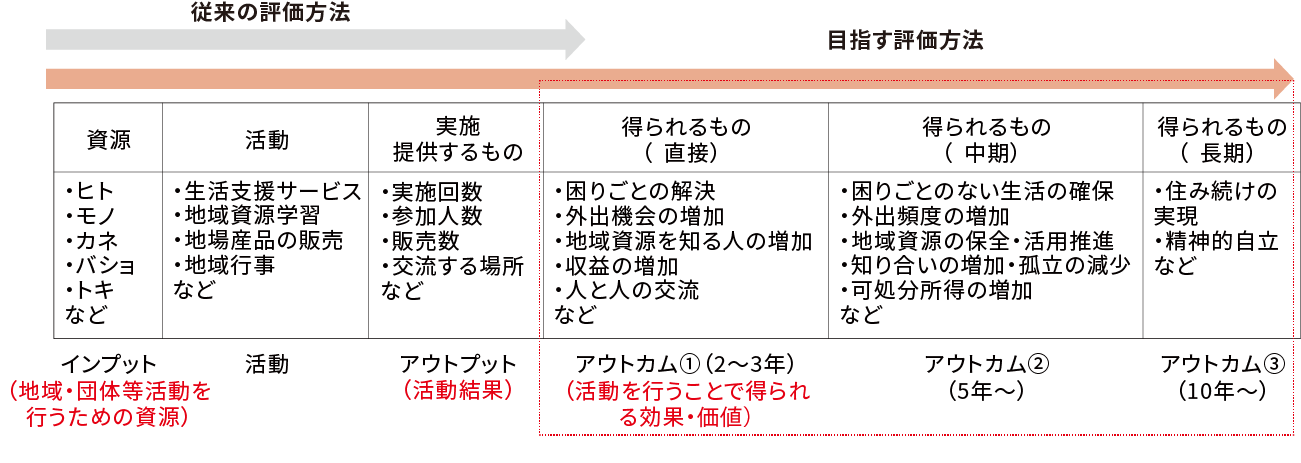 地域運営を担う団体の活動を、目標に照らし合わせて自らチェックしていくとともに、公益的な取り組みについて周囲の理解を得て、公共的な事業を持続的に受託したり、仲間を増やしたりしていく必要があります。 ここでは主に、社会的インパクトを評価する手法としてロジックモデルを活用した手法を紹介します。 本手法で作成した評価項目を実際に使うのは活動開始後ですが、事前に作業することで活動目標を整理することにつながりますので、活動開始の初期段階から取り組みましょう。