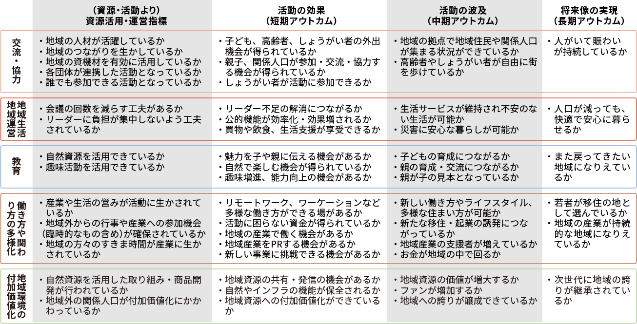 活動の資源、活動内容、アウトカム(効果や意義)から、評価の指標を抽出します。 アンケートなどで計測しやすい項目や、地域の方が理解しやすい項目とします。