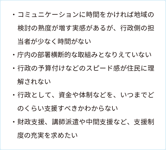 | 中間支援(直接)タイプ | 行政職員が、地域での会議への参集、開催、取りまとめなどを担う方法。必要に応じて地域ごとに職員を配置する。 他業務も実施する中で様々な地域に関与しており、職員の負担が大きいのが課題。 |